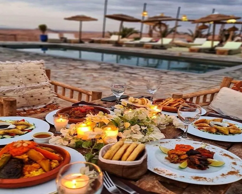 عشاء رومانسي في صحراء أغفاي أثناء مشاهدة غروب الشمس فوق صحراء أغفاي وتجربة الضيافة البدوية الحقيقية. استمتع بتجربة المأكولات المغربية التقليدية تحت سماء صحراء أغافاي المرصعة بالنجوم وتناول العشاء في خيمة بدوية حول نار المخيم والعرض البدوي.